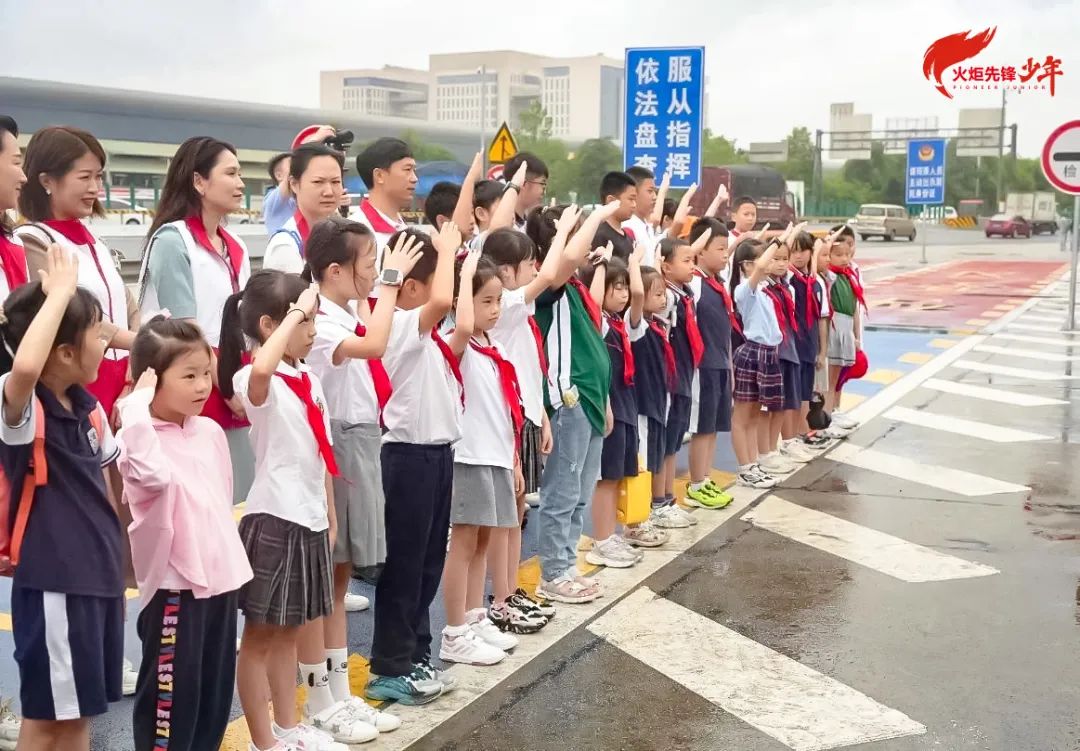 一位交警叔叔为小志愿者们展示了交警手势。只见交警叔叔身姿挺拔地站在雨中,为大家展示标准的交通手势。小志愿者们围拢在一旁,眼睛一眨不眨,充满了好奇和期待。